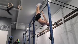 Start in an inverted hang on the bar or rings. Open your legs into a wide straddle position. While keeping your arms completely straight, slowly lower your body until you reach a horizontal position, and then continue until you are hanging vertically. Maintain a flat back and an engaged core throughout the entire range of motion. Focus on pushing the bar or rings down toward your hips to engage the lats. The goal is to control the descent as slowly and evenly as possible.